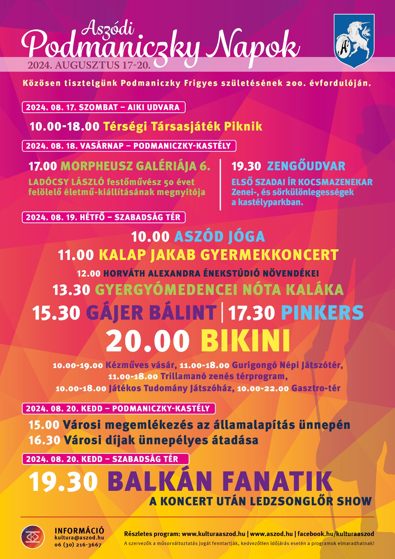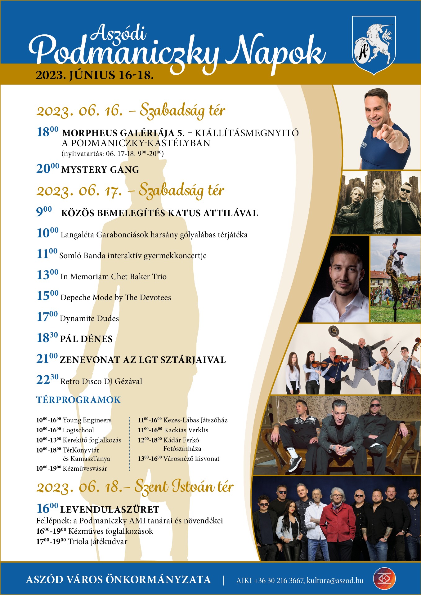 Pénteken ismét kitárja kapuját Aszód előtt a Podmaniczky -kastély és megnyílik a Morpheus Galériája, immáron 5. alkalommal, majd a Zenepavilonban a Mystery Gang koncertjéval veszi kezdetét a főtéri programok sora.